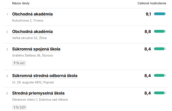 V kategórii stredných odborných škôl naša škola získala 5. najvyššie hodnotenie v rámci Slovenska so skóre 8,4 z 10 (rovnako ako 3. a 4.miesto).