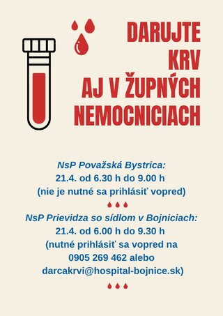 NsP Prievidza so sídlom v Bojniciach (od 6.00 h do 9.30 h - je nutné prihlásenie vopred na 0905 269 462 alebo darcakrvi@hospital-bojnice.sk).